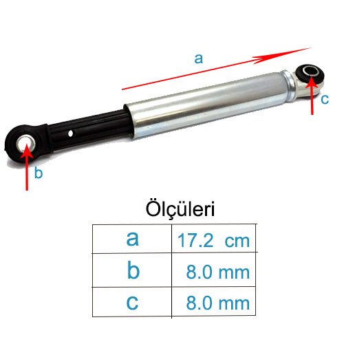 Önemli Uyarı : Çamaşır Makinesinde titreşim veya sallanma ile ilgili gerekli randımanı almak istiyorsanız tüm amortisörlerin değiştirilmesi tavsiye edilmektedir. a ' da belirtilen ölçü 0.5 mm - 1 mm uzun veya kısa olması çok etki etmemektedir. b veya c' de belirtilen çap büyük olursa eski amortisörün demir pimi çıkarılıp b - c kısmına, plastik ile beraber veya plastiği çıkarıp eski demir pimi yerleştirin.