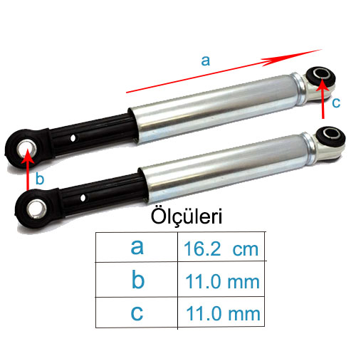 Önemli Uyarı : Çamaşır Makinesinde titreşim veya sallanma ile ilgili gerekli randımanı almak istiyorsanız tüm amortisörlerin değiştirilmesi tavsiye edilmektedir. a ' da belirtilen ölçü 0.5 mm - 1 mm uzun veya kısa olması çok etki etmemektedir. b veya c' de belirtilen çap büyük olursa eski amortisörün demir pimi çıkarılıp b - c kısmına, plastik ile beraber veya plastiği çıkarıp eski demir pimi yerleştirin.